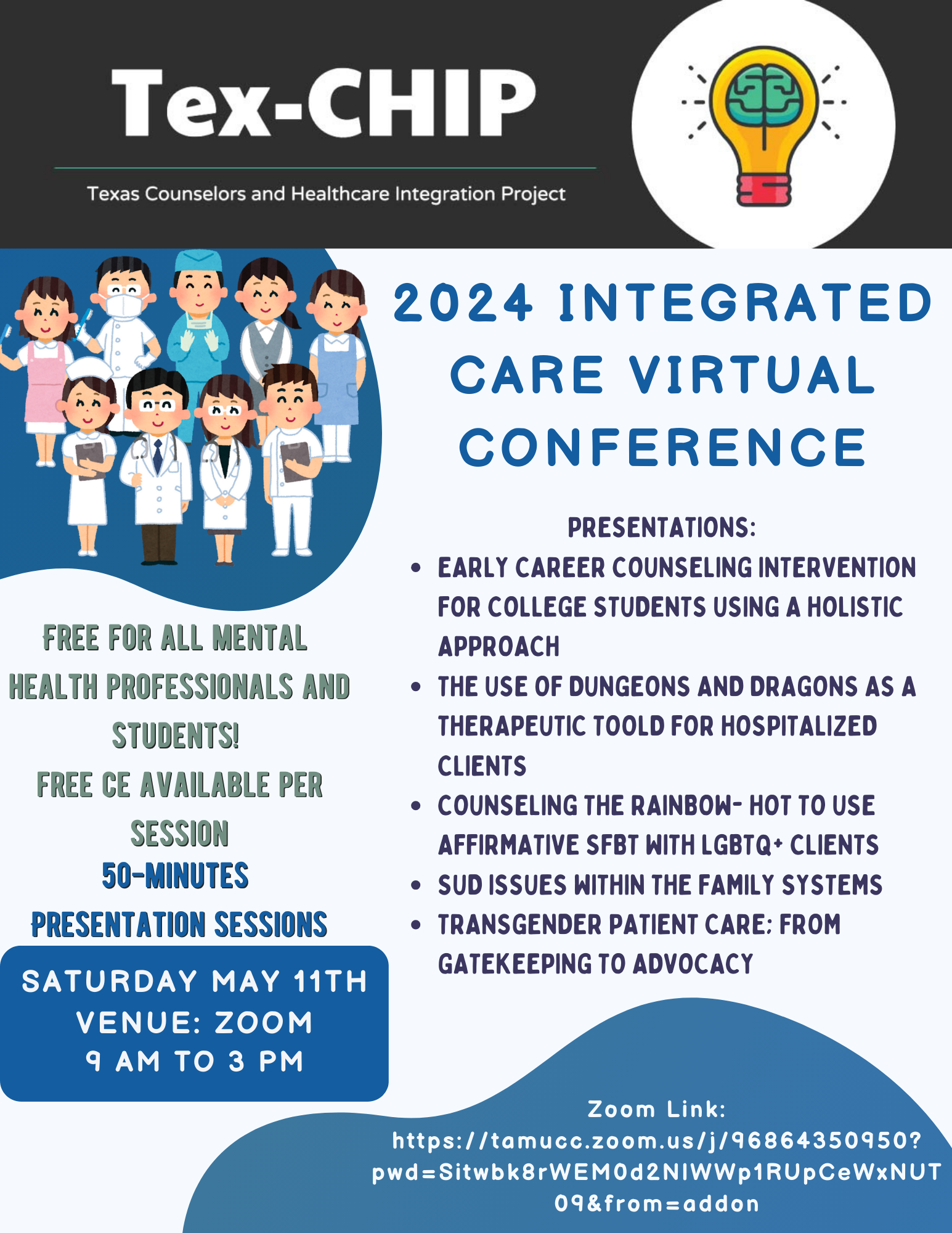 The Texas Counselors and Healthcare Integration Project (Tex-CHIP) promotes a behavioral health workforce for professional counselors who specialize in providing integrated behavioral healthcare (IBHC) within medically-underserved communities.