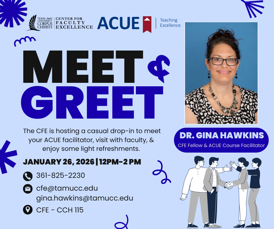 Join Dr. Gina Hawkins (CFE Fellow and ACUE Course Facilitator) for an ACUE Meet and Greet on Monday, January 26, 2026, from 12–2 pm in the Center for Faculty Excellence (CCH 115). No RSVP needed.