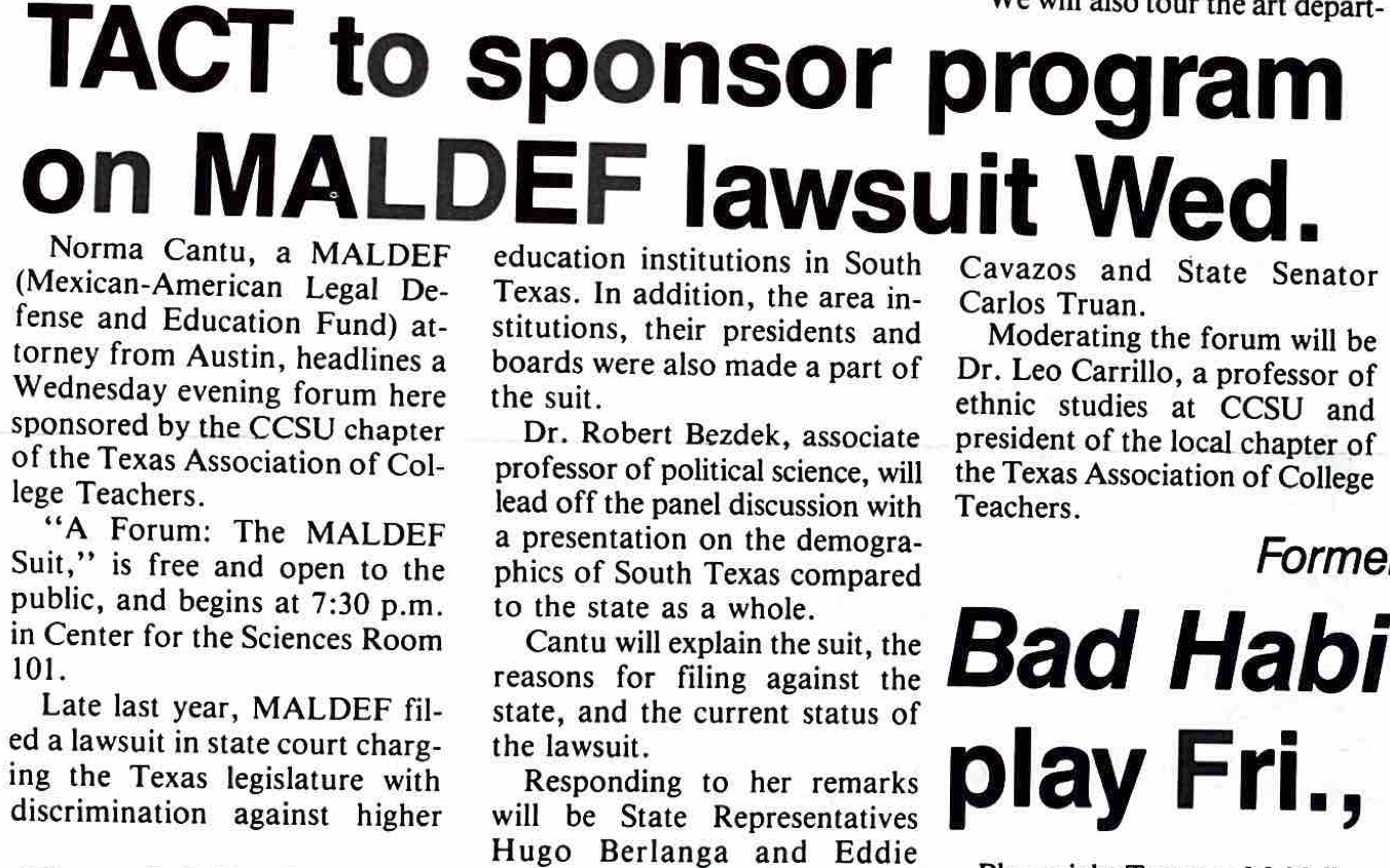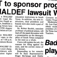 This article provided updated information about the MALDEF filed a lawsuit in the state court charging the state legislature with discrimination against higher education institutions in South Texas.