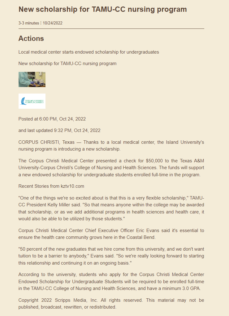KZTV 10 Corpus Christi. (2022, October 24). New Scholarship for TAMU-CC nursing program. KZTV 10 Corpus Christi. https://www.kztv10.com/news/local-news/new-scholarship-for-tamu-cc-nursing-program