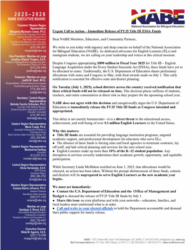 National Association for Bilingual Education. (2025, July 2). Urgent Call to Action – Immediate Release of FY25 Title III ESSA Funds. https://drive.google.com/file/d/1EA-0uAhEBBZ7zQ0Je-rNZRwZlI0T4pdf/view?usp=sharing
