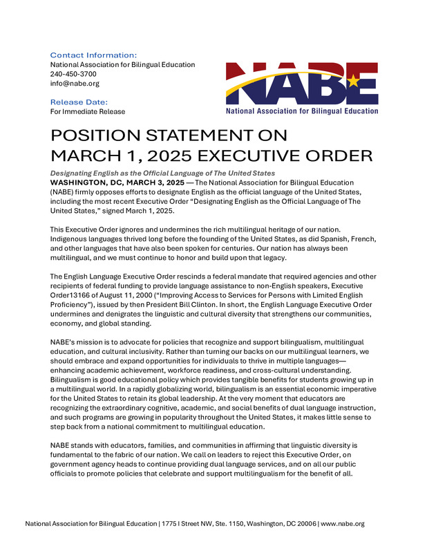 National Association for Bilingual Education. (2025, March 3). Position statement on March 1, 2025 executive order.