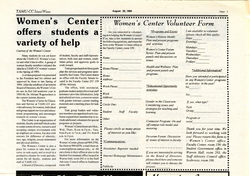 Women’s Center offers students a variety of help. (1996, August 28). TAMU-CC Island Waves. 3.