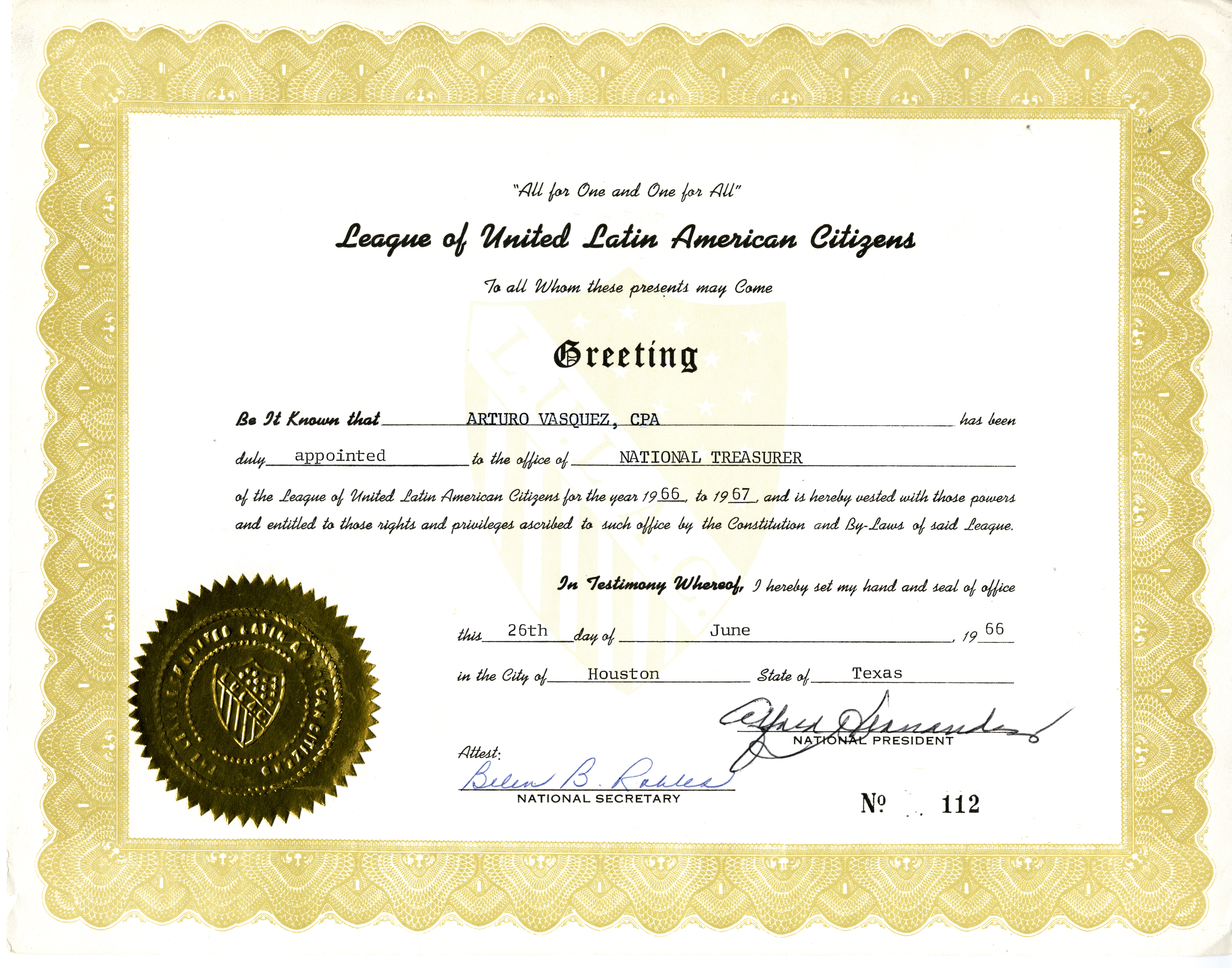 - A certificate from the League of United Latin American Citizens, appointing Arturo Vasquez as the National Treasurer of LULAC for 1966-1967.