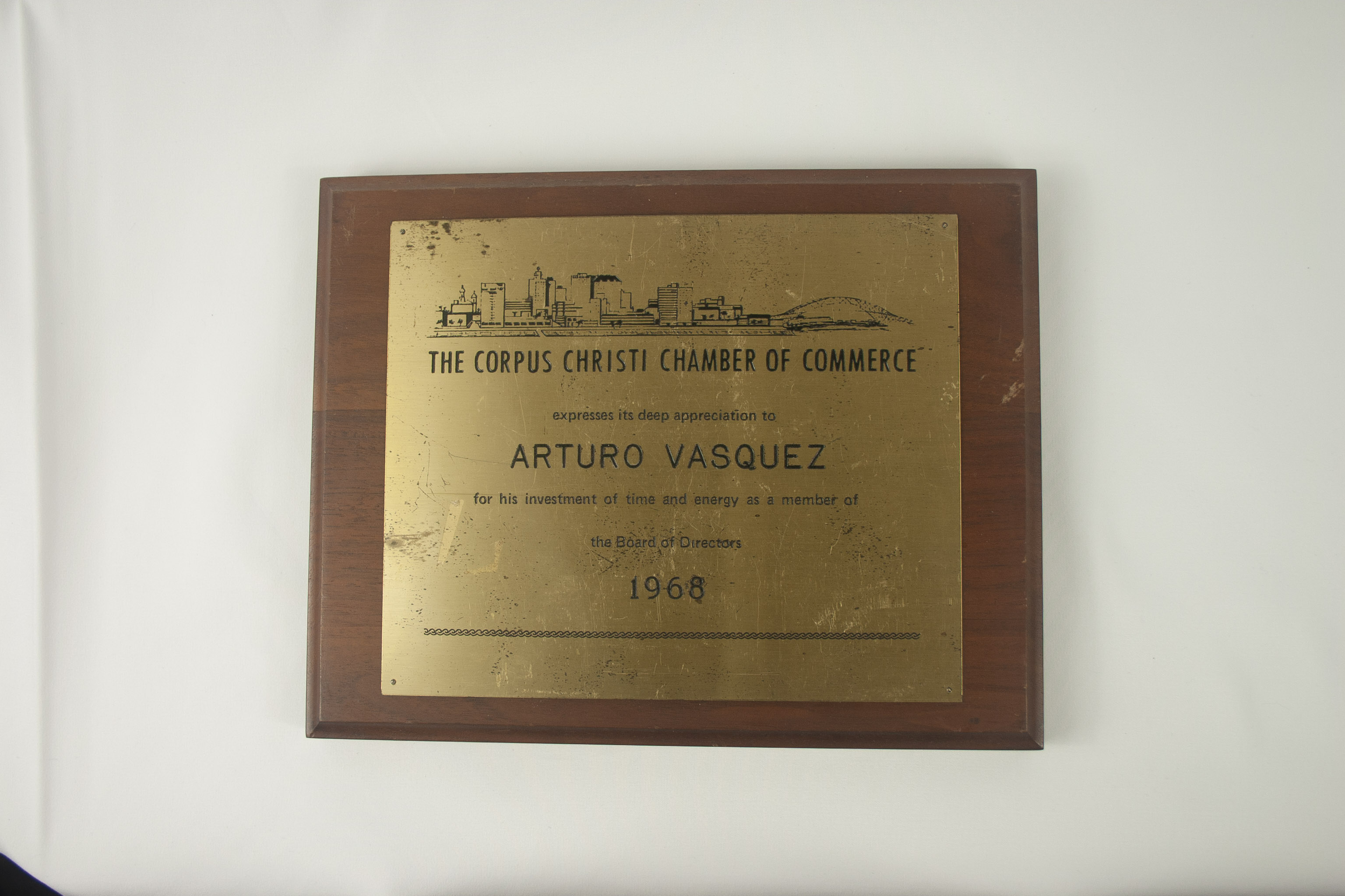 A plaque of Appreciation from the Corpus Christi Chamber of Commerce to Arturo Vasquez