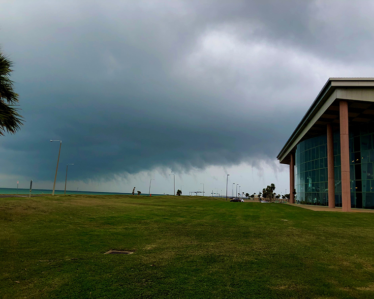 Color photograph of low wispy storm clouds. The landscape includes an expanse of grass, a building, and a bay.