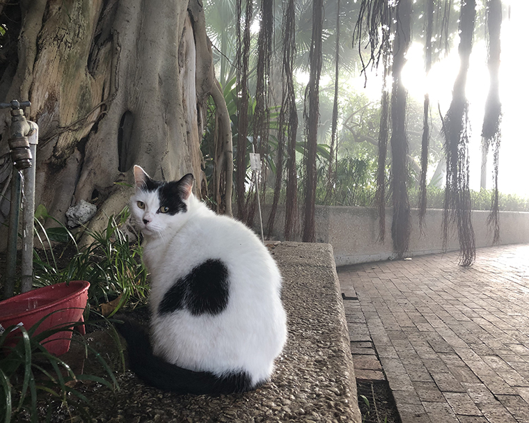 Color photograph of a black and white cat in a misty overgrown patio. The cat is sitting next to a water faucet dripping in to a bright red bowl.