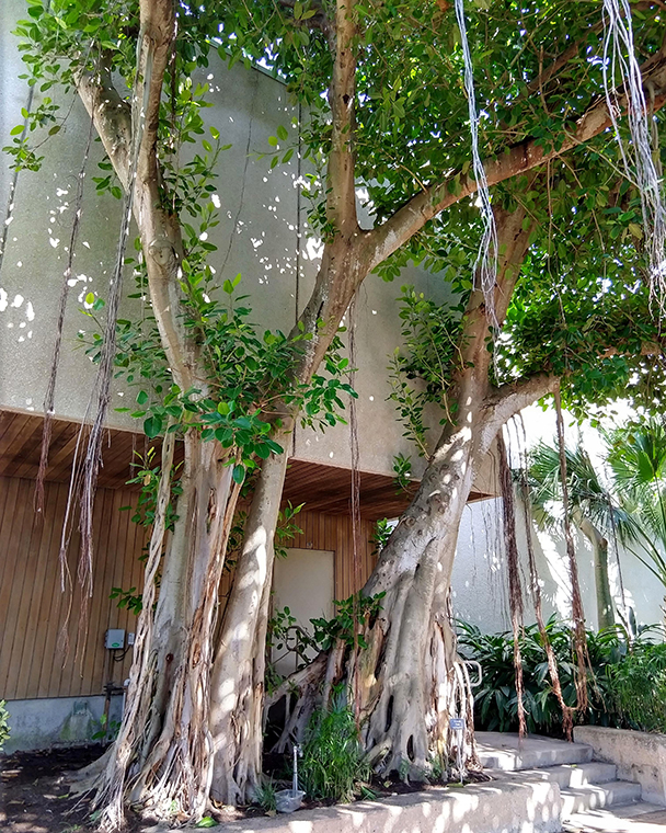 Color photograph of two large Banyan Trees on the side of a building