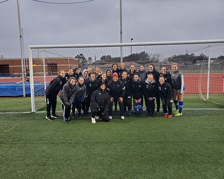 Color photograph of a group of individuals in front of a soccer net. The sky is overcast and the people are dressed for cold weather.