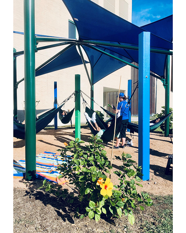 Color photograph of people relaxing in blue and green hammocks in the sunshine. A flowering bush is in the foreground.