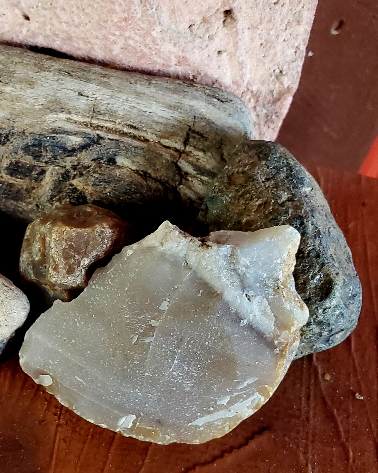 A variety of rocks and petrified wood are arranged on a dark wooden surface.