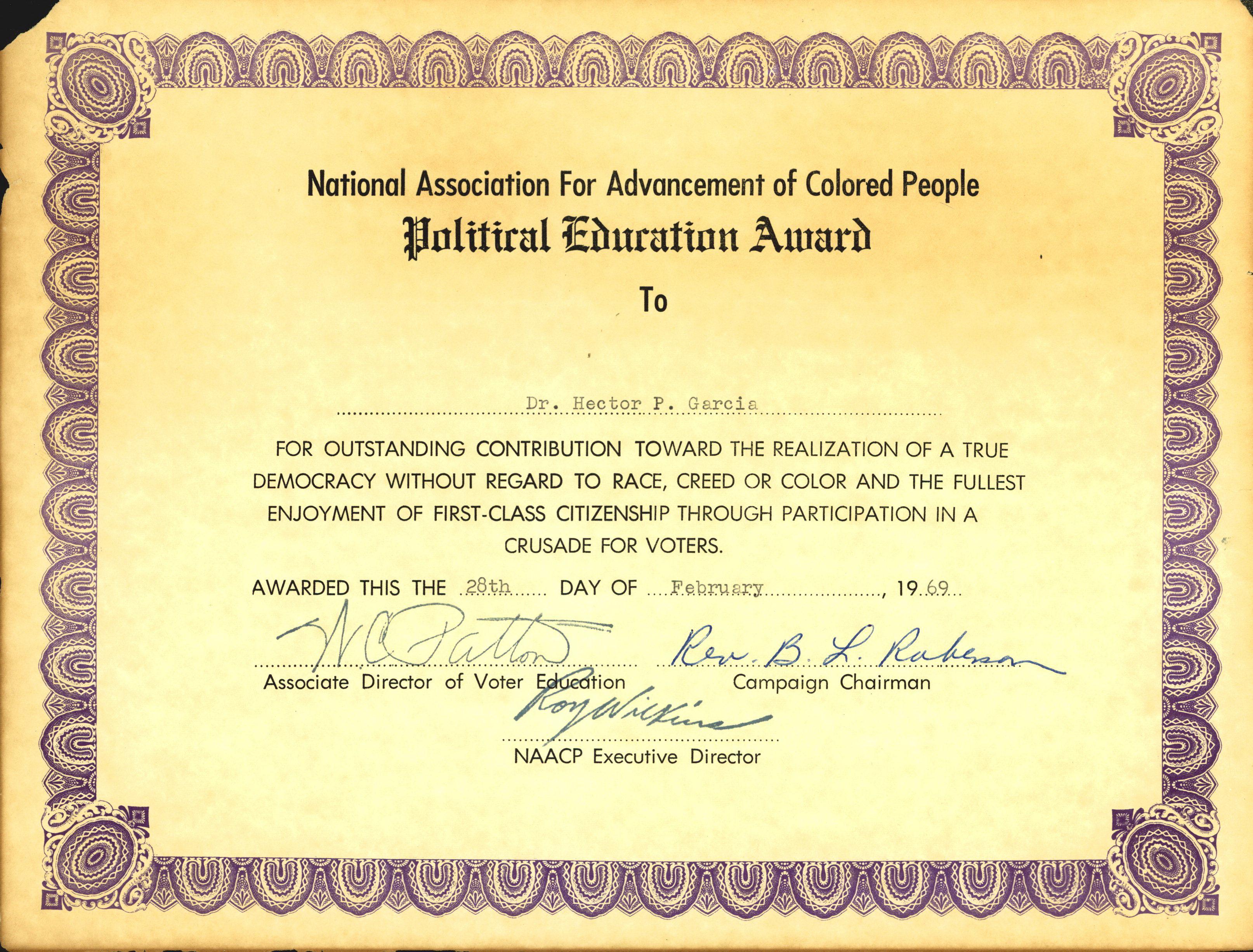 The National Association for the Advancement of Colored People (NAACP) presented Dr. Garcia with a Political Education Award, acknowledging his “crusade for voters.”