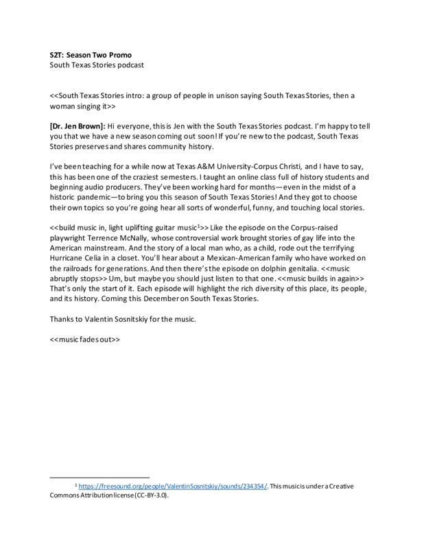 - The South Texas Stories podcast preserves and shares community history. Season Two explores all sorts of wonderful, funny, touching, and educational local stories. Each episode highlights the rich diversity of this place, its people, and its history. Coming December 2020.