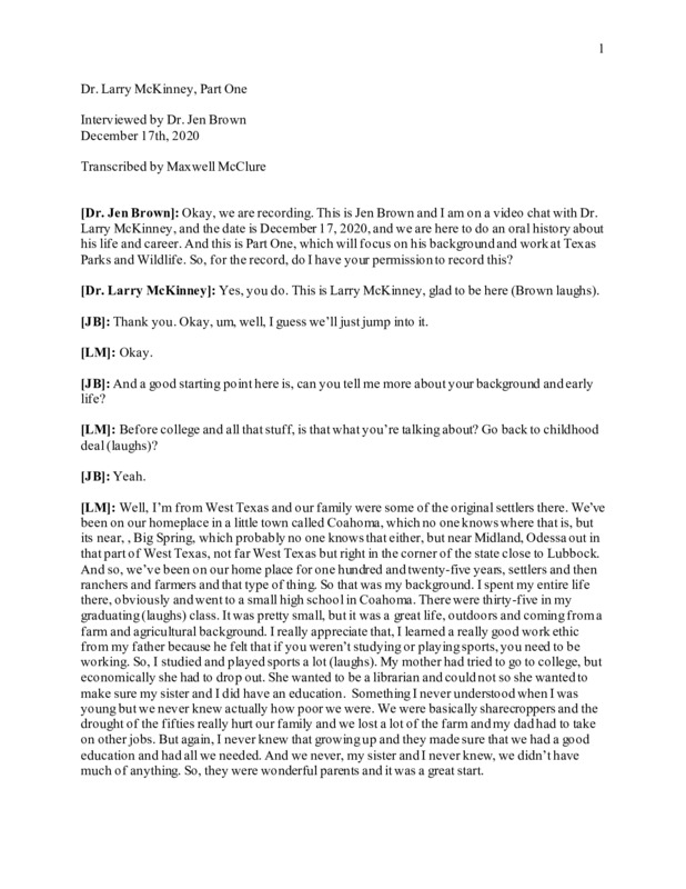 This is an oral history interview of Dr. Larry McKinney interviewed by Dr. Jen Brown. Part One covers Dr. McKinney's early life; growing up in West Texas; the drought of the 1950s; how he got interested in marine biology; graduate school and his work with amphipods; his work at Texas Parks and Wildlife; diving; fishing; and other topics.